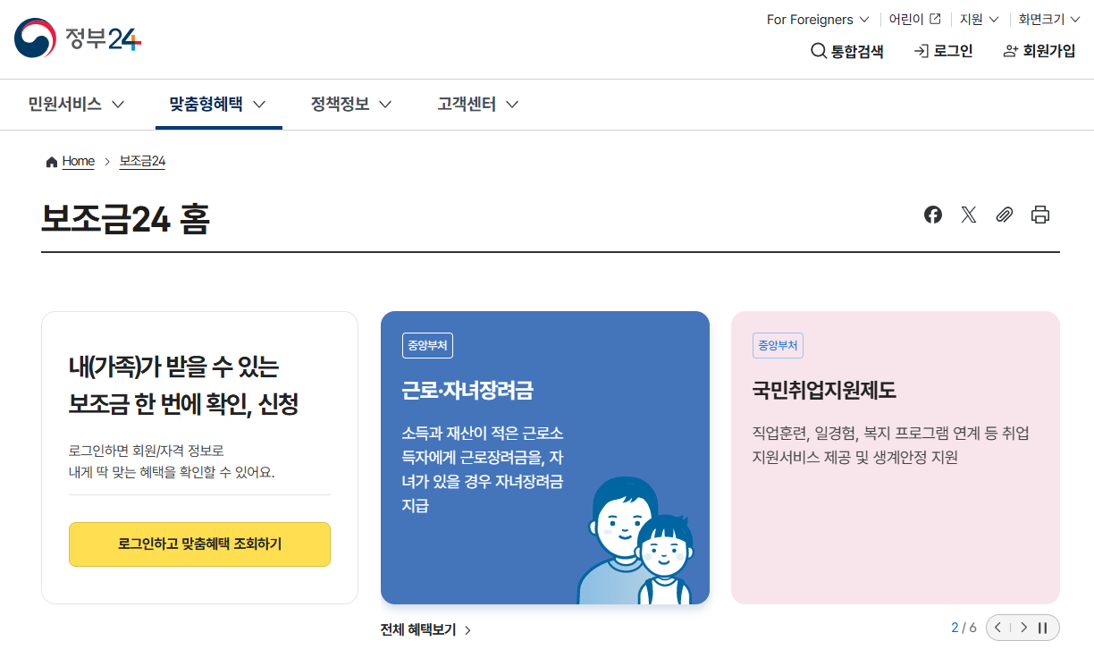 공식 포털(정부24 → 보조금24, 복지로, 지자체 홈페이지 등)에서 본인이 받을 수 있는 지원금을 먼저 확인 - 자격 요건 검토