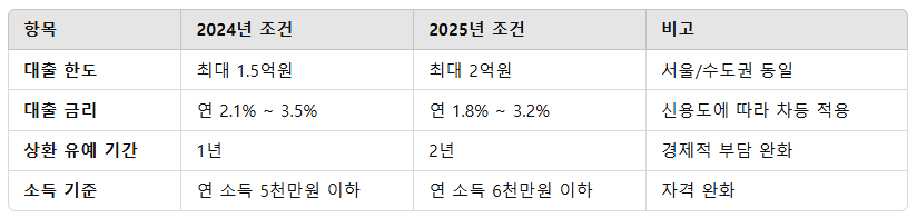 2025년부터 청년 전세대출의 주요 조건이 변경되었습니다. 아래 표에서 구체적인 변화를 확인할 수 있습니다.